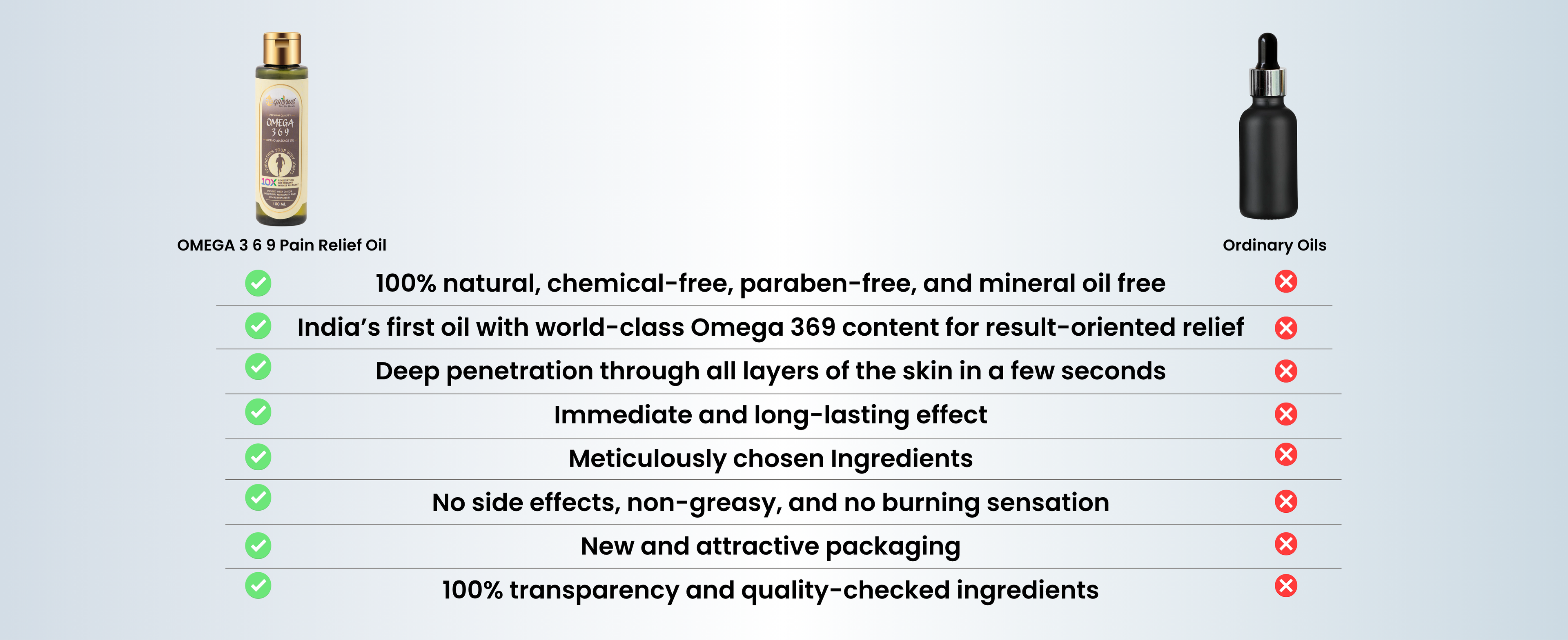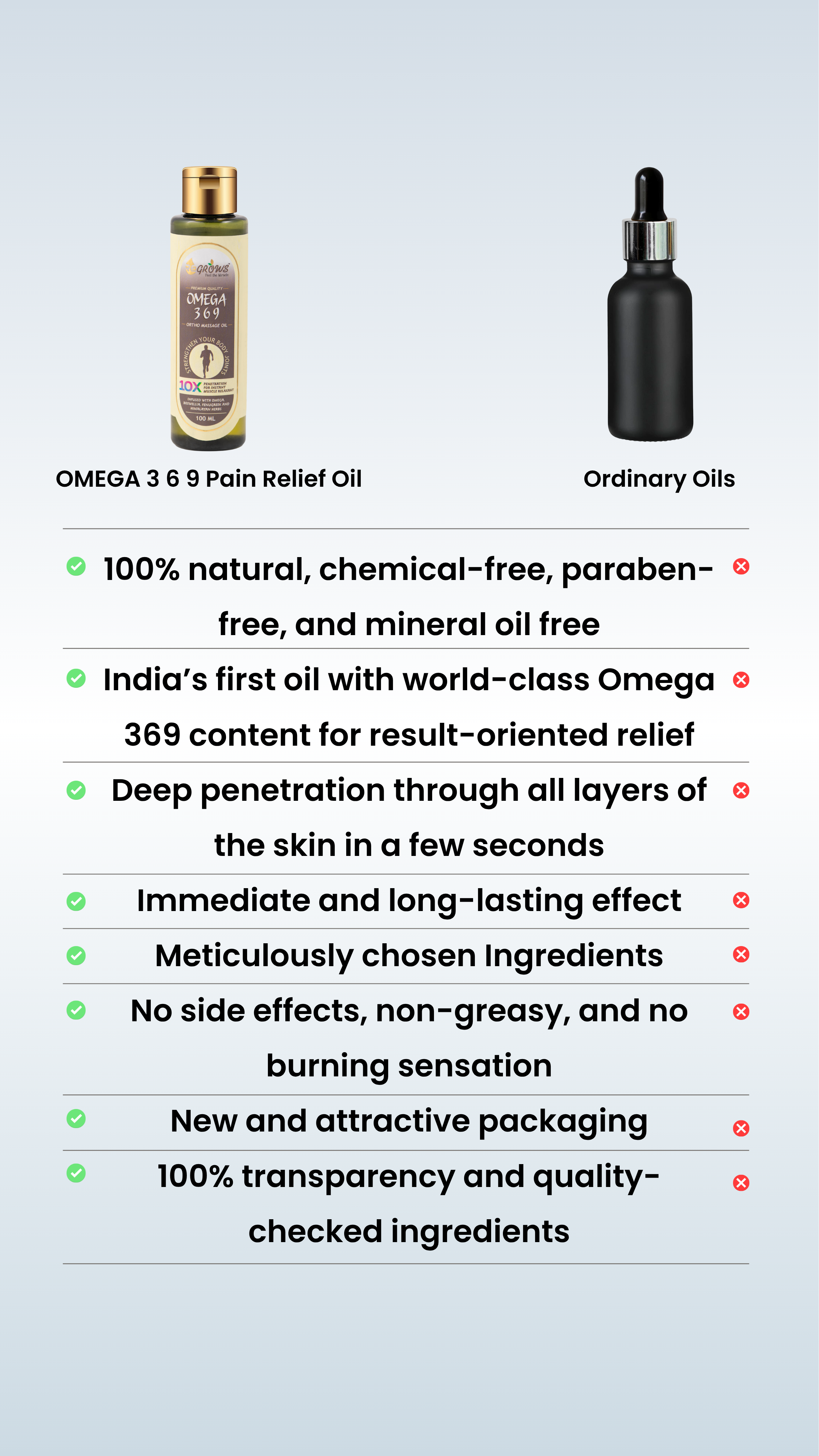 Unlock the power of India’s first OMEGA 369 OIL with 24 miraculous ingredients for immediate and long-lasting pain relief.